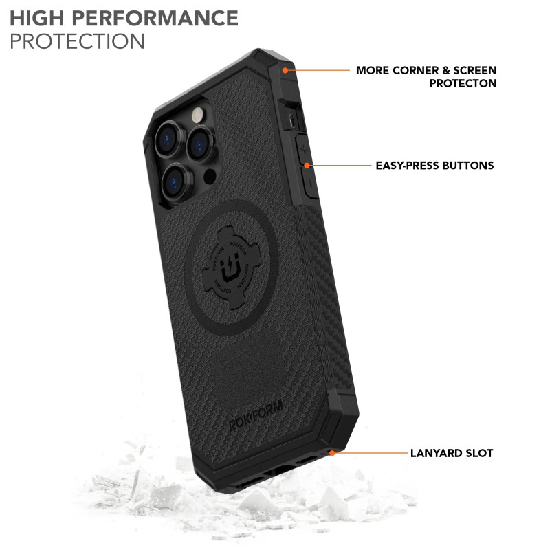 ALL NEW iPhone 14 Pro Max Rugged Case Built for Life-On-The-Go: The latest generation of the ROKFORM Rugged Series case for the iPhone 14 Pro Max is our best yet. Durable and functional on the inside and out, the new Rugged series builds on its reputation as one of the most versatile iPhone 14 Pro Max cases around. Extra strength MagSafe® compatible magnet array provides a mind-blowingly powerful hold to all MagSafe® accessories and any magnetic surface. The integrated RokLock® mount allows for fast and secure mounting on bikes, motorcycles, cars, and more. Combine all that with 360-degree military-grade drop protection and a slim feel that easily slides in and out of your pocket to have ROKFORM’s top-of-the-line Rugged case.