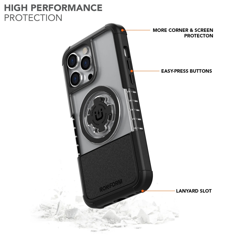 ALL NEW iPhone 14 Pro Max Crystal Case Show Your Colors: The latest generation of the ROKFORM Crystal Series case for the iPhone 14 Pro Max is here. Building on one of our best-selling cases, you can now see more of your iPhone 14 Pro Max without sacrificing protection. Extra strength MagSafe® compatible magnet array provides a mind-blowingly powerful hold to all MagSafe® accessories and any magnetic surface. The integrated RokLock® mount allows for fast and secure mounting on bikes, motorcycles, cars, and more. The all-new iPhone 14 Pro Max Crystal series case provides 360-degree military-grade drop protection, tough Crystal-clear polycarbonate to show off the color of your new iPhone®, and a slim feel that easily slides in and out of your pocket.
