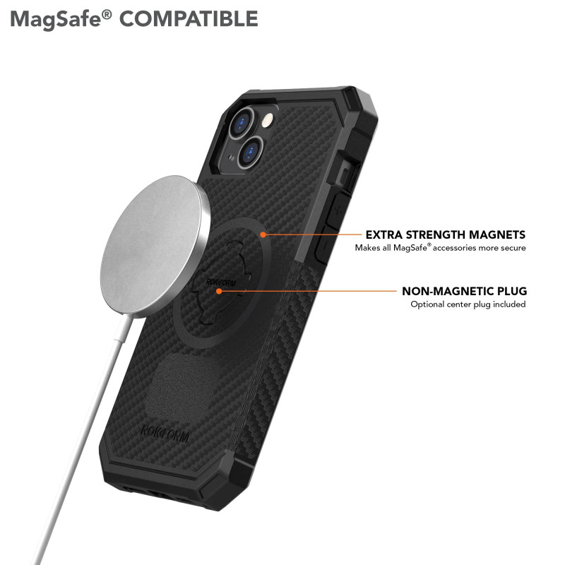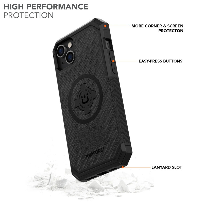 ALL NEW iPhone 14 Plus Rugged Case Built for Life-On-The-Go: The latest generation of the ROKFORM Rugged Series case for the iPhone 14 Plus is our best yet. Durable and functional on the inside and out, the new Rugged series builds on its reputation as one of the most versatile iPhone 14 Plus cases around. Extra strength MagSafe® compatible magnet array provides a mind-blowingly powerful hold to all MagSafe® accessories and any magnetic surface. The integrated RokLock® mount allows for fast and secure mounting on bikes, motorcycles, cars, and more. Combine all that with 360-degree military-grade drop protection and a slim feel that easily slides in and out of your pocket to have ROKFORM’s top-of-the-line Rugged case.