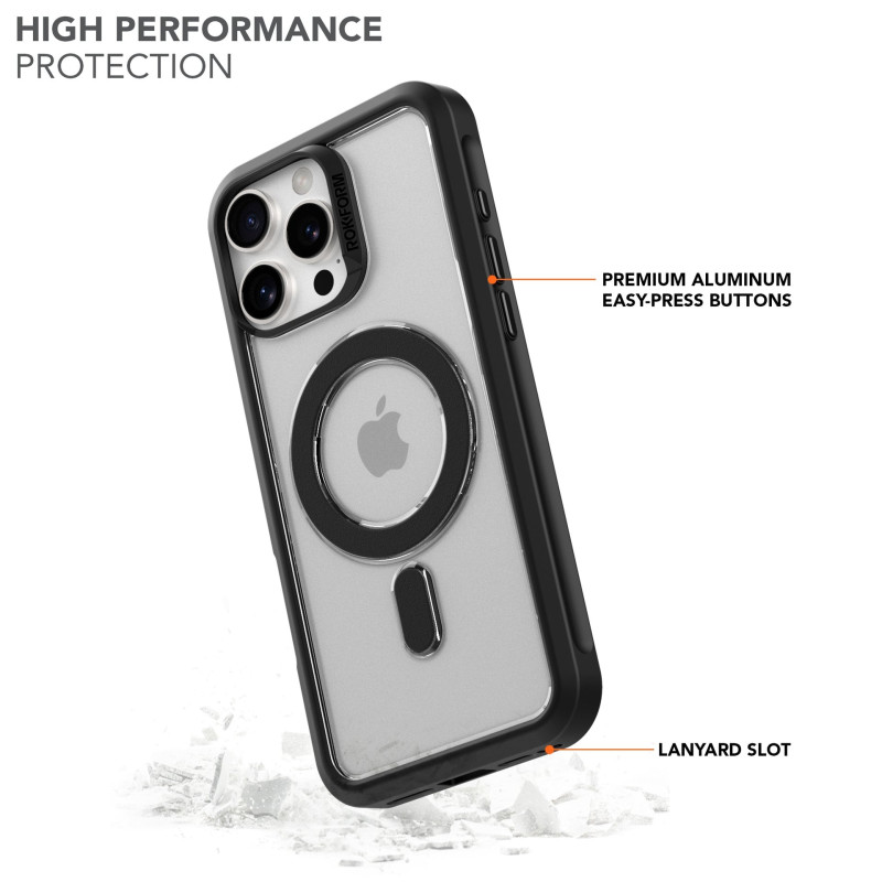 If you want the best thin iPhone 16 Pro Max case for your new phone, Rokform has you covered. Our all new iPhone 16 Pro Max Slim case is our slimmest case design yet. At 82.4 x 167.8 x 13.2mm, they're 35% thinner than our Rugged and Crystal cases. Its clear back and transparent black bumper lets you show off your phone colors. But you still get military-grade protection against multiple 6-foot drops.