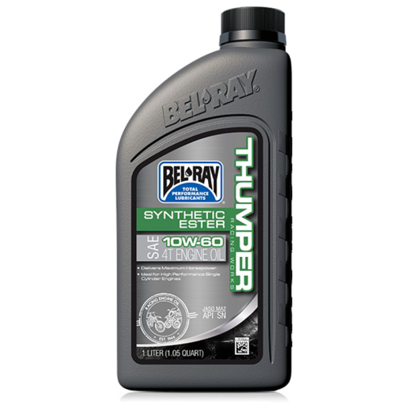 Bel-Ray Thumper Racing Works Synthetic Ester 4T Engine Oil is a 4-stroke synthetic motorcycle racing oil that has been developed for full works competition use and is designed to withstand extreme racing conditions. Full synthetic ester base oils withstand the highest temperatures and stresses and provide the ultimate performance for 4-stroke motorcycles. Meets API SN and JASO MA2 requirements. Suitable for air-cooled/liquid-cooled 4-stroke engines and wet clutches.