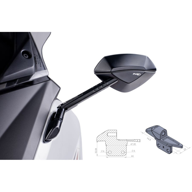 They allow the Puig mirrors to be mounted on the motorcycle's fairing. Manufactured from a block of high-performance aluminum and anodized in black. Consult specific mirror and motorcycle models.