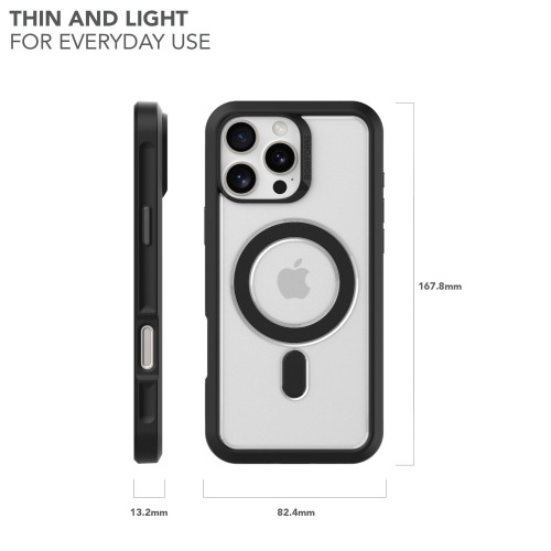 If you want the best thin iPhone 16 Pro Max case for your new phone, Rokform has you covered. Our all new iPhone 16 Pro Max Slim case is our slimmest case design yet. At 82.4 x 167.8 x 13.2mm, they're 35% thinner than our Rugged and Crystal cases. Its clear back and transparent black bumper lets you show off your phone colors. But you still get military-grade protection against multiple 6-foot drops.