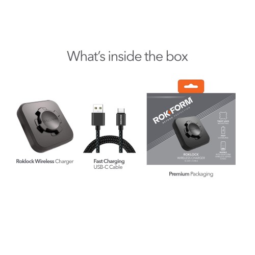 • Simply lock the RokLock Wireless Charger to your RokLock Car Dash Mount or Windshield Suction Mount for fast wireless charging