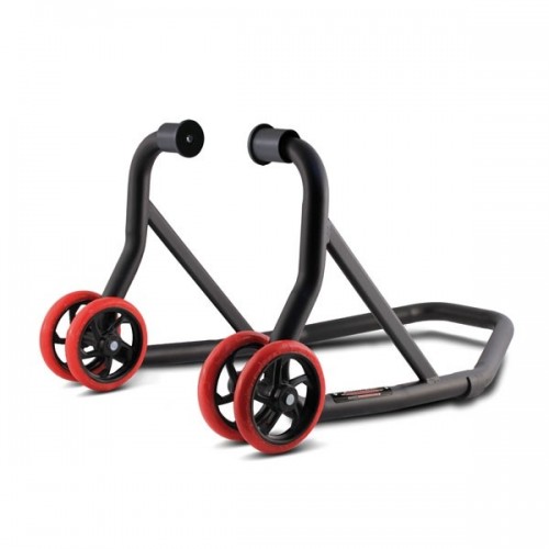 Valter Moto front stand is developed to be the stronghest stand in VMC line. Is made with strong steel with two reinforcement on both arms. It is painted with a special embossed long life powder coating. Is equipped with four red/black large wheels VMC designed for more strenght. It must be used to lift bike by front radial calipers. The width can be manually adjusted to fit with all racing bikes. Available only in black color.
