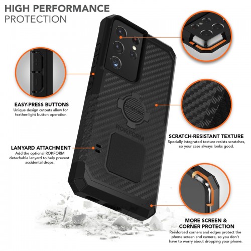 Rokform best-selling RUGGED case just got even better for the new Samsung Galaxy S22+ 5G. Our new Galaxy S22+ 5G case has even more screen, corner, and camera protection without adding bulk, so it still feels slim and fits easily in your pocket, but you don't have to worry about drops of up to 6 feet! We have also increased the magnet size and force for even more holding power at the gym, on your fridge, toolbox, and even the golf course. Now included in each of our Galaxy S22+ 5G Rugged cases is our Magnetic RokLock Plug for extra hold and perfectly balanced landscape and portrait mounting on our Vent Mount, Swivel mount, and Low Pro car mounts, allowing for easy reading of your maps, GPS and incoming calls. The integrated ROKLOCK® twist-lock lets you indulge in effortless, secure mounting of your phone to bicycles, cars, motorcycles, and more. The scratch-resistant carbon fiber texture and anti-slip grip mean your phone case will always look great, and you won't have to worry about it sliding around. Like all ROKFORM cases, a lanyard slot comes standard and will work with almost any lanyard for extra security and drops prevention.