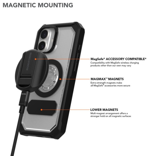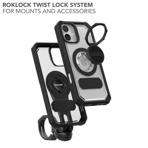 Our new iPhone 16 Plus clear case showcases your phone's color but provides military-grade protection. Its crystal clear polycarbonate can handle multiple drops up to 6 feet. You also get enhanced camera protection, raised buttons that are easy to press, and the strongest MagSafe® compatible magnets. Rokform's clear iPhone 16 Plus case absorbs shocks and drops up to 4x better than other cases. You can instantly stick it to any magnetic surface or securely twist and lock it to any of our twist lock mounts, just like our Rugged case.