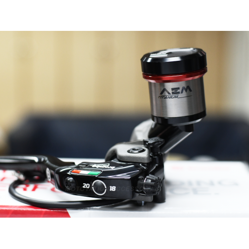 The integrated version of the AEM titanium fluid tank, is designed to install directly into Brembo CORSA CORTA master cylinder, without a fluid tube. The result is a very clean setup of your handlebar.