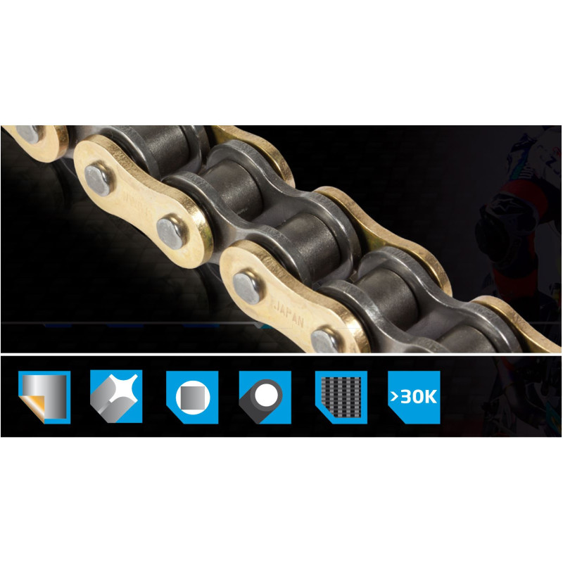 A third generation series, developed to meet the demand of OE-engineers for a light running, long lasting chain with high tensile strength, for current high performing machines. TX4 seal rings keep lubricant in and dirt out of the inner parts. Sleek design with gold coloured link plates distinguishes its appearance.