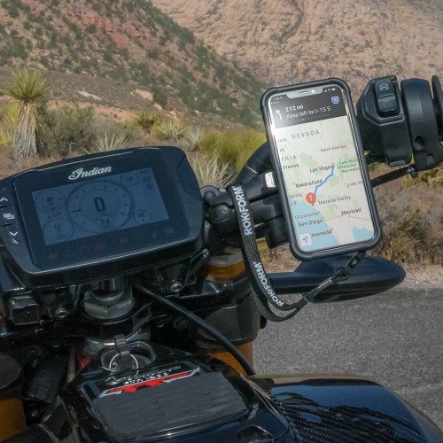 The new Rokform Universal Ball Adapter Phone Mount is easy to use and RAM® 1” ball mount compatible. The compact assembly features a CNC Machined Aluminum body, lock and lever arm for long lasting durability and secure phone mounting. The all black finish blends perfectly into your bikes controls and will quickly and easily secure your phone in portrait or landscape mode. The 1” rubber coated ball allows for easy adjustment for the perfect viewing angle and a secure hold. A detachable lanyard is included for an extra layer of security on and off the bike.
